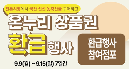 해양수산부(장관 강도형)와 농림축산식품부(장관 송미령)는 추석명절 소비자 물가부담 완화를 위해 9월 9일(월)부터 9월 15일(일)까지 전국 전통시장*에서 「추석맞이 전통시장 온누리상품권 환급행사」를 개최한다.