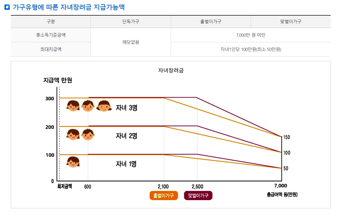 자녀장려금은 신청자와 가구원이 소유한 재산(부동산, 자동차, 예금 등) 합계액이 2억 4천만원 미만이며, 소득 7,000만원 미만이여야 합니다. (2023.06.01 기준)