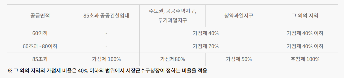 민영주택 일반공급 입주자 선정 시 일정비율(나머지 비율은 추첨으로 선정)을 가점제로 선정합니다.